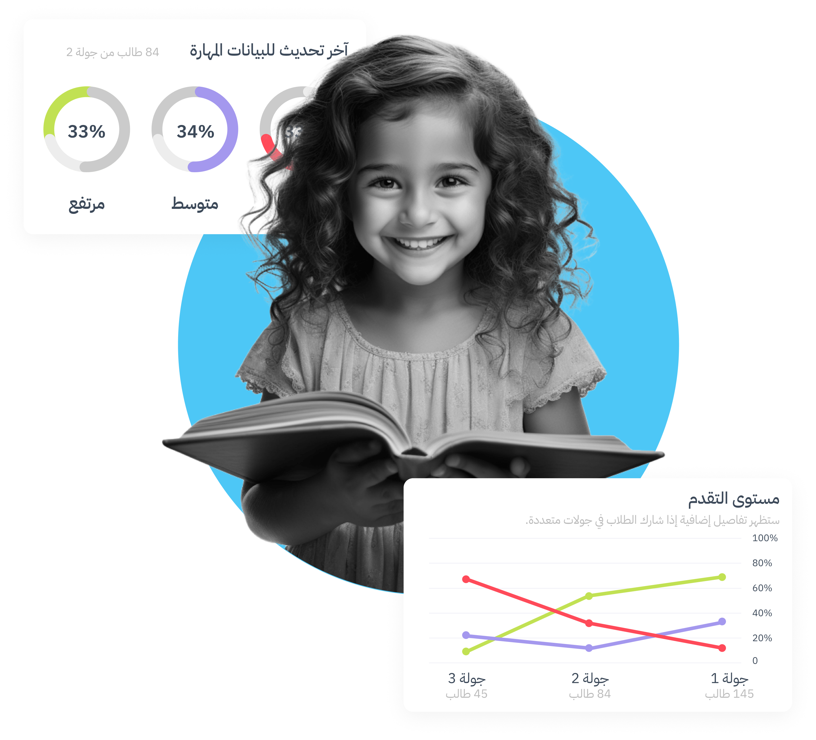 لوحة بيانات مفصلة تبقيك مطلعاً على نتائج الأطفال بالإضافة لـ 17 تحليلاً إضافياً لأداء الأطفال.